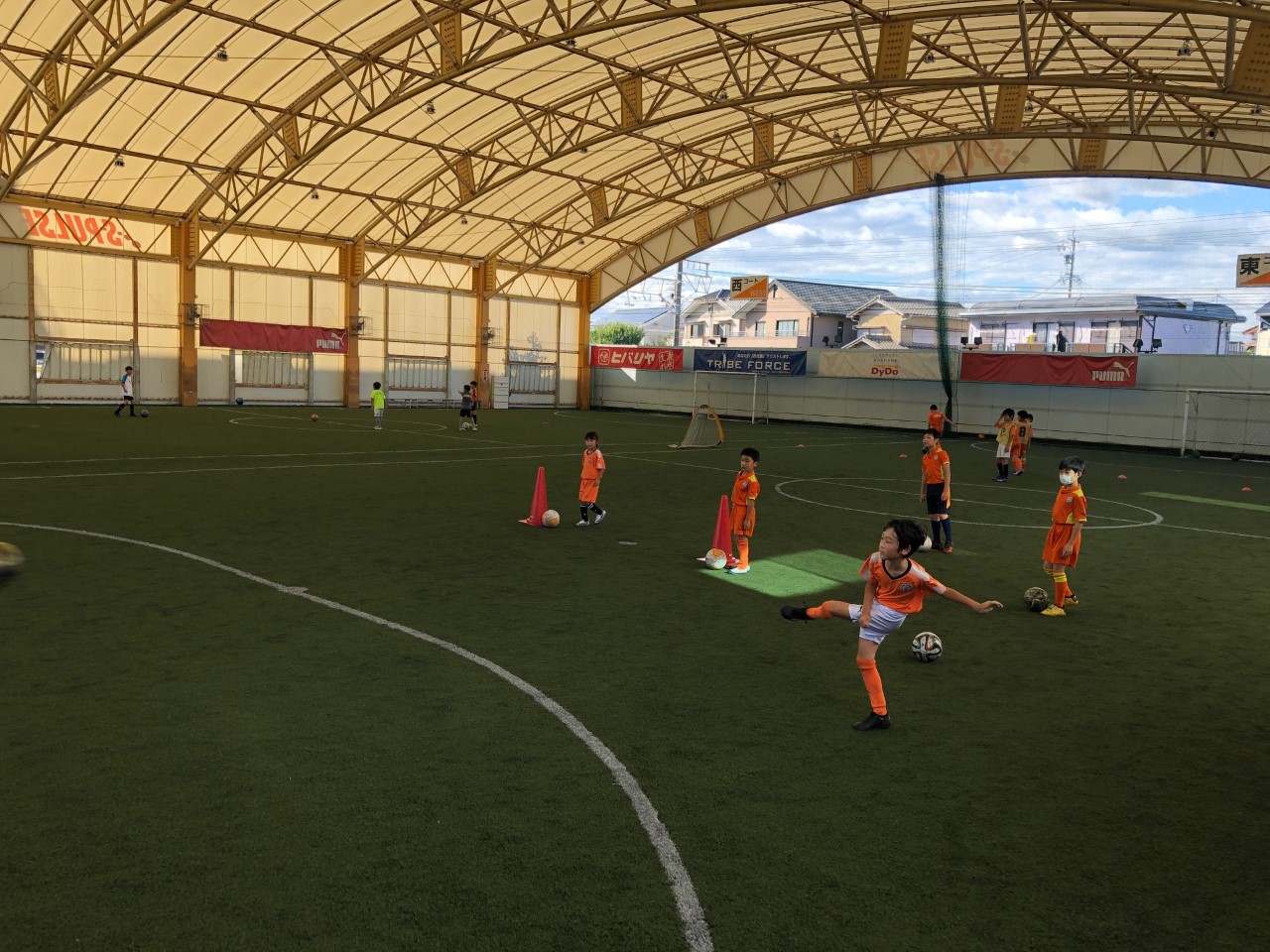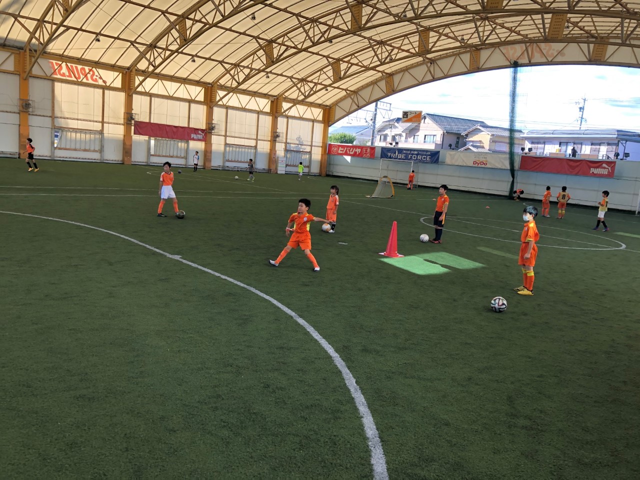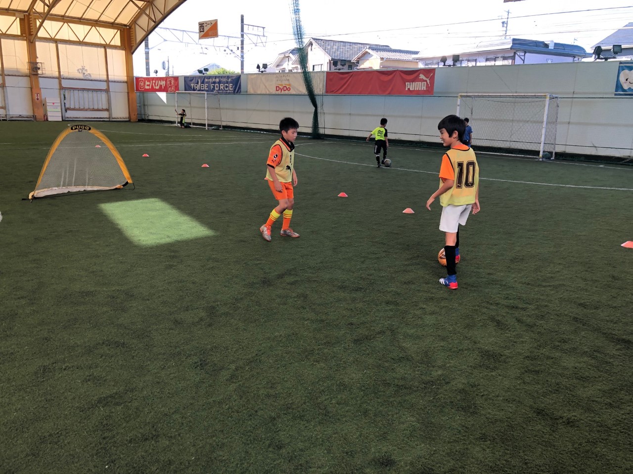 また、ドリブルシュートや角度のない場所からのシュートなど色々な場面をコーチが用意すると、ゴールに置いたコーンやビブスの的に「当たった!」と喜んで教えてくれました。