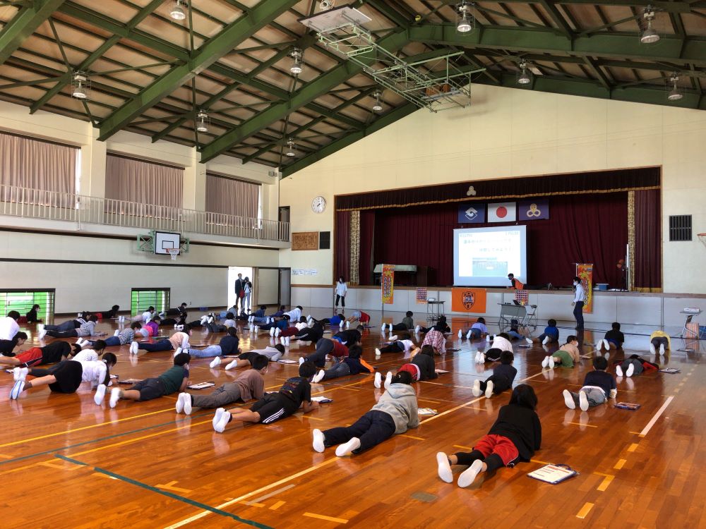 授業では、梅田選手がシュートする時の体の動きをスローカメラで観察し、関節と筋肉の働きを考えました。また、サッカーで大事な体幹トレーニングにも挑戦してもらい、楽しみながら知識を深めていきました。