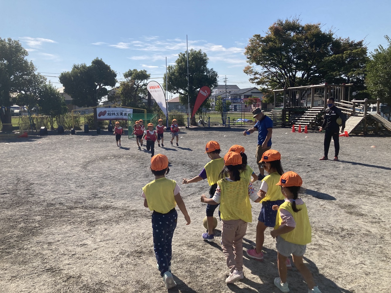 雲ひとつない快晴の中、所狭しと元気よく走る子どもたちの姿が印象的でした。コーチの話を背筋が伸びた状態で聞こうとする様子はさすが年長さんだと感じることが出来、とても素晴らしい機会となりました。