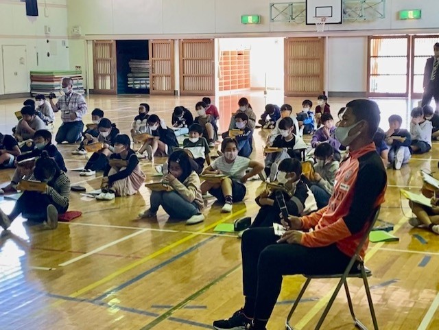 今回の授業では、中島小学校の5年生が今年度取り組んでいる「地域の防災マップ作り」の事前学習として、学区内の危険が予想される場所を考えたり、地震の揺れや津波に対して安全な場所はどこなのか、児童たちと川本選手で一緒に考えていきました。