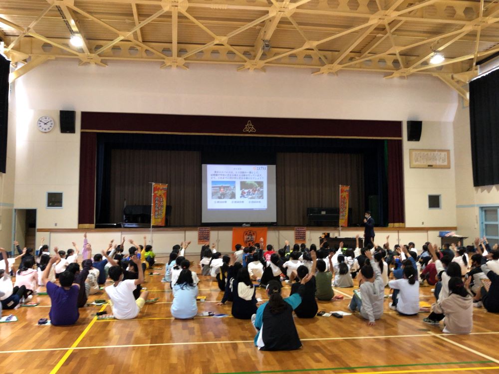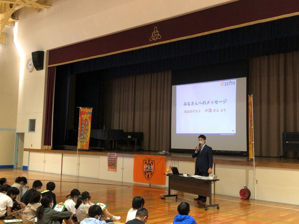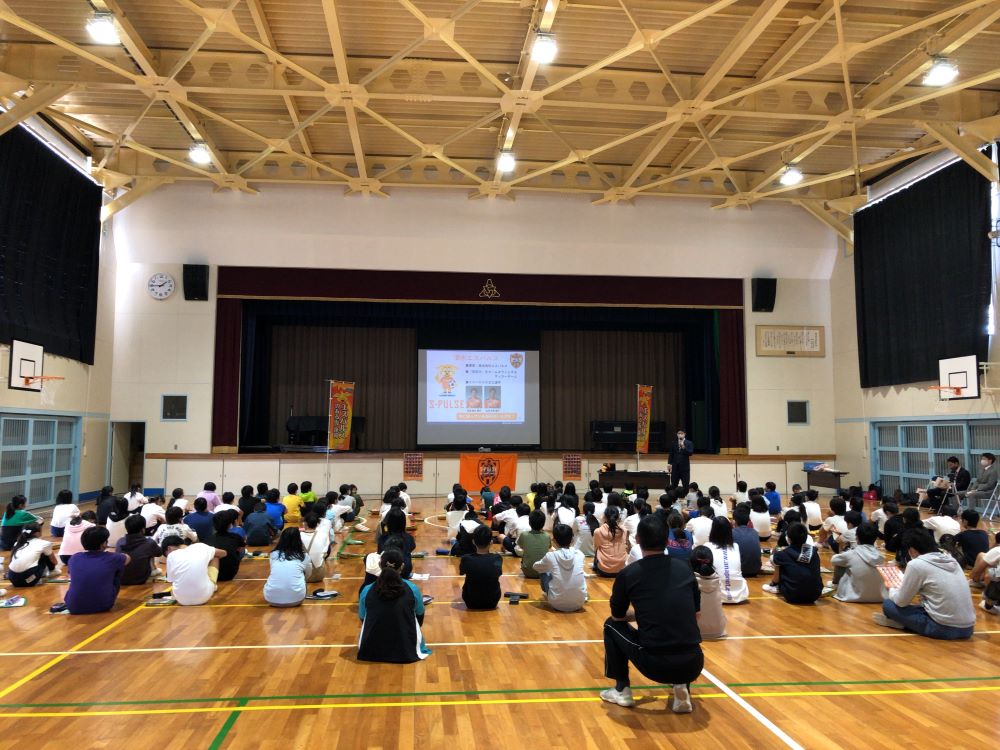 最後に小池は児童たちに対し、「サッカーチームには、選手以外にも様々な仕事があり、多くの人がチームを支えています。どんな職業も同じで、皆さんが普段目にする仕事以外にもたくさんの人が関わっています。また、皆さんの住むホームタウンにプロサッカーチームがあることを誇りに思い、試合観戦をしたりイベントに参加したりして、エスパルスを身近に感じてください。」とメッセージを送りました。