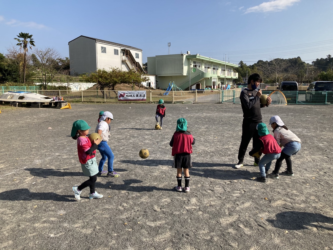 暖かい日差しの下、園庭に集まった子どもたちは元気よく活動しました。ボールを使った内容では何度も何度もチャレンジする姿が素晴らしく、上手に出来た時の喜びがコーチ達にもよく伝わりました。