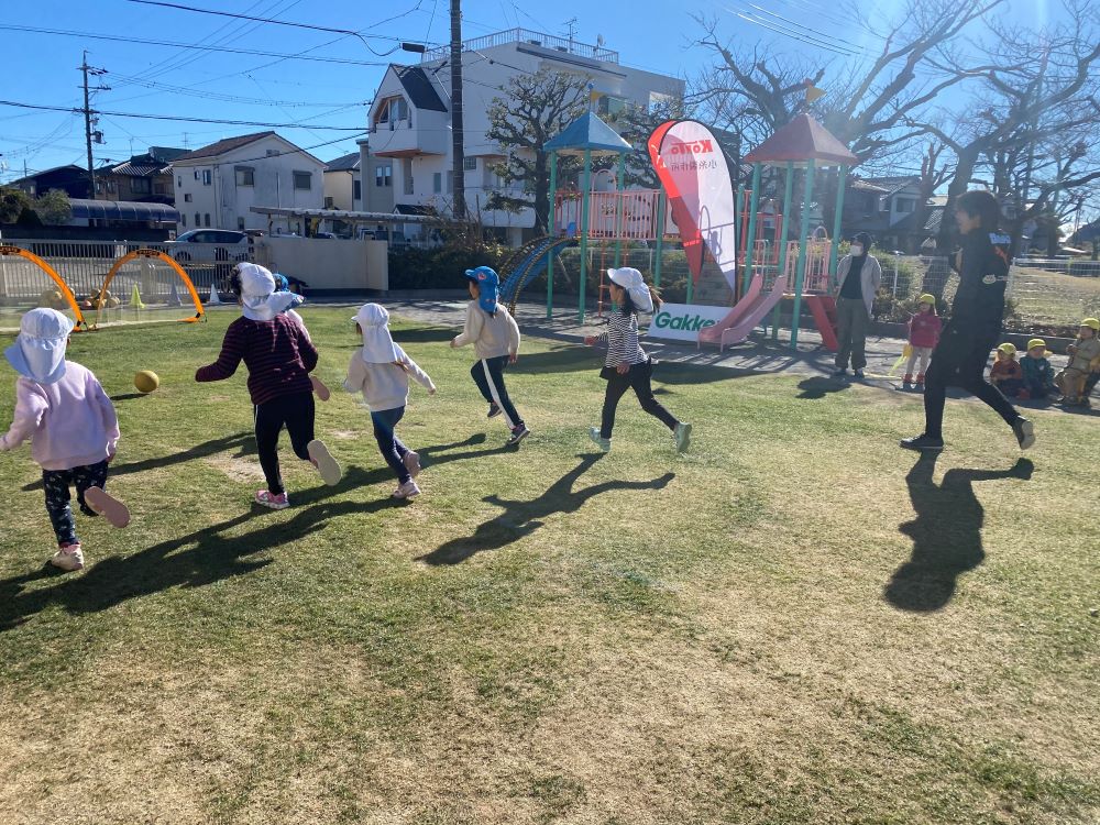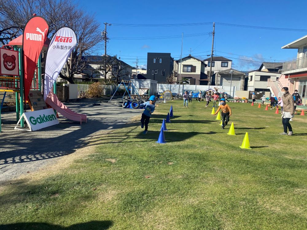 きれいな天然芝の園庭をたくさん走り、元気いっぱいな子ばかりで、 「転んでも大丈夫!」とすぐに立ち上がって、何度も挑戦する様子が見られました。