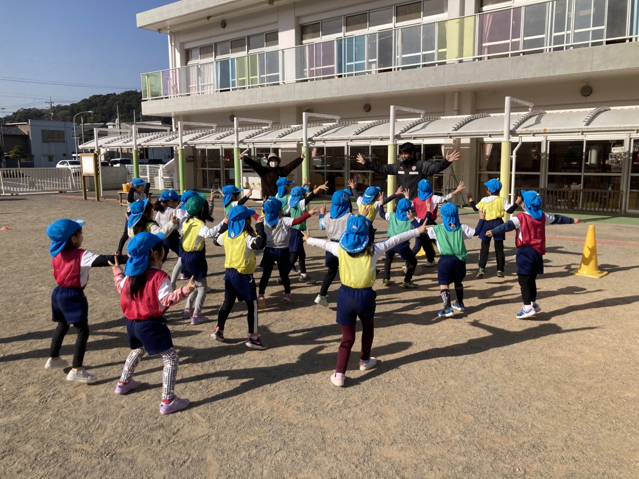 コーチや先生の話を良く聞いて集中して取り組んでいる姿がとても印象的でした。強い風にも負けず元気よく園庭を目一杯使って身体を動かし、最後はとても充実した様子が伺えました。