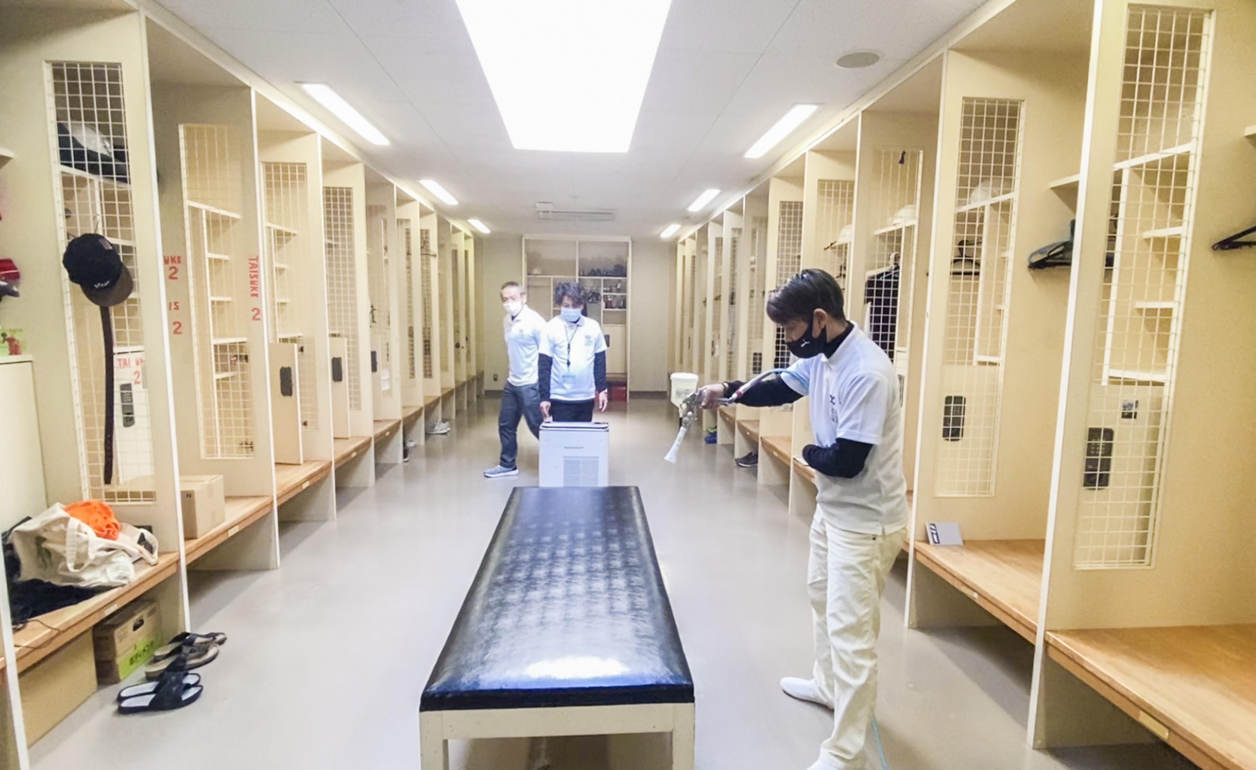 選手・スタッフの皆様に対し、少しでも安心して普段どおりのトレーニングに打ち込めるようにお手伝いが出来ないかと思い、ナノゾーンソリューション(光触媒による抗菌コーティング)を清水エスパルス様に寄付施工させていただくことを決め、ロッカールーム・トレーニングルーム・メディカルルーム、トイレ、本社入り口共用部へ施工させていただきました。