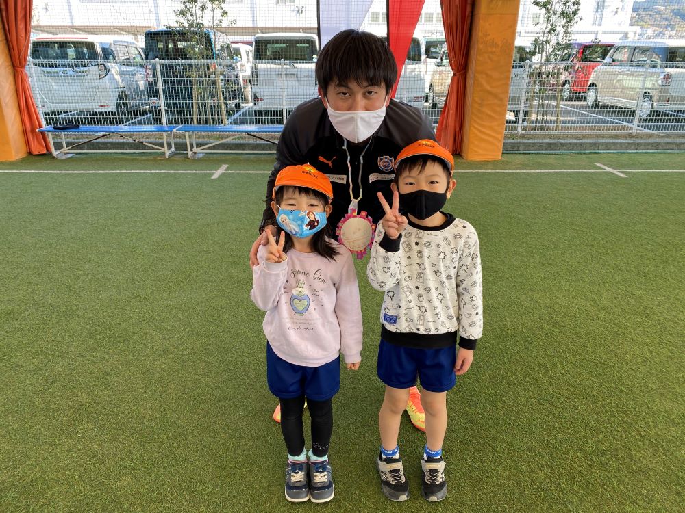 活動中は笑顔が多く楽しみながらも、時に真剣な顔をして一生懸命ボールを追いかけていました。終了後には、コーチに手作りのメダルをプレゼントしてくれました。