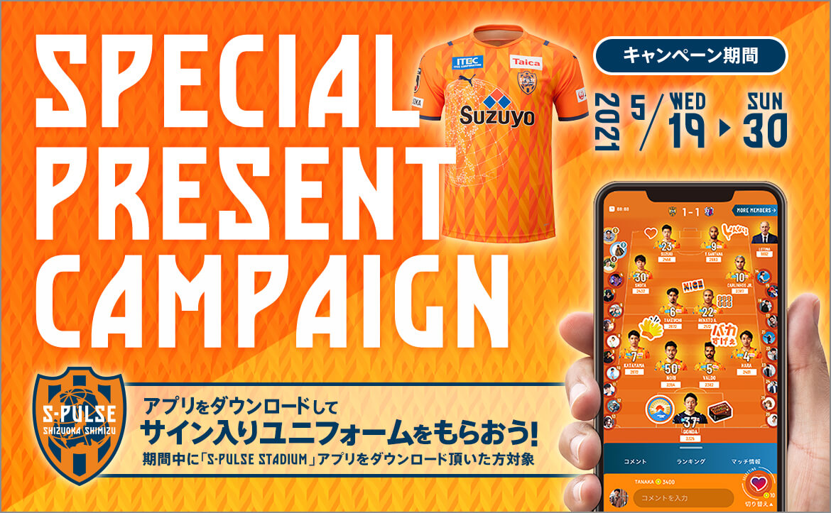 キャンペーン期間中に『S-PULSE STADIUM』をダウンロードすると『選手サイン入りユニフォーム』が当たるチャンス!ぜひこの機会に『S-PULSE STADIUM』をダウンロードして、皆さんのサッカー観戦をより楽しいものにしてください!