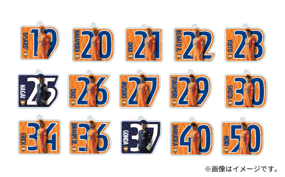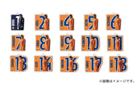 背番号を背景に選手の勇ましい姿がデザインされた「プレイヤーズアクリルキーホルダー」発売中!