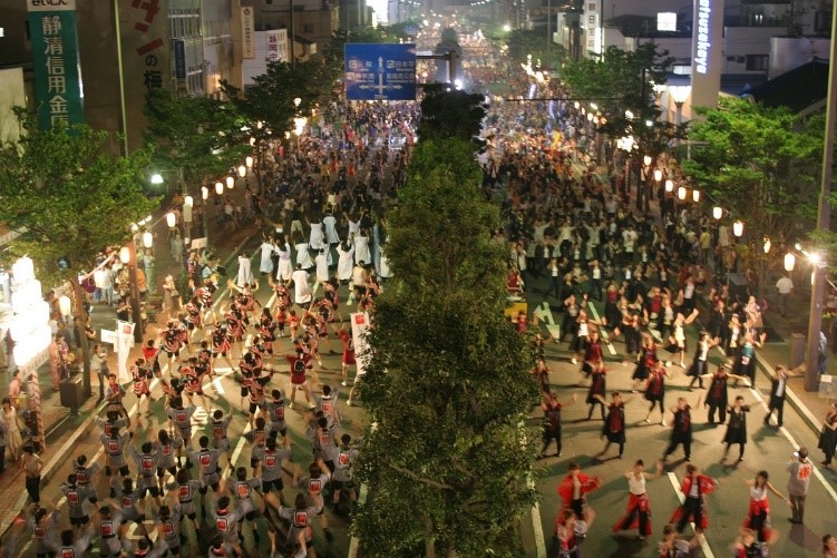 1947年の8月4日清水港開港記念日に合わせ、戦後の復興、市民の将来への希望を込めてスタートした祭り。40年目の1987年には、「港かっぽれ」が誕生し、多くの人が踊る祭りとなりました。最終日には「海上花 火大会」が行われ、毎年のべ70万人を超える人々が楽しむ、静岡市最大級の夏行事です。