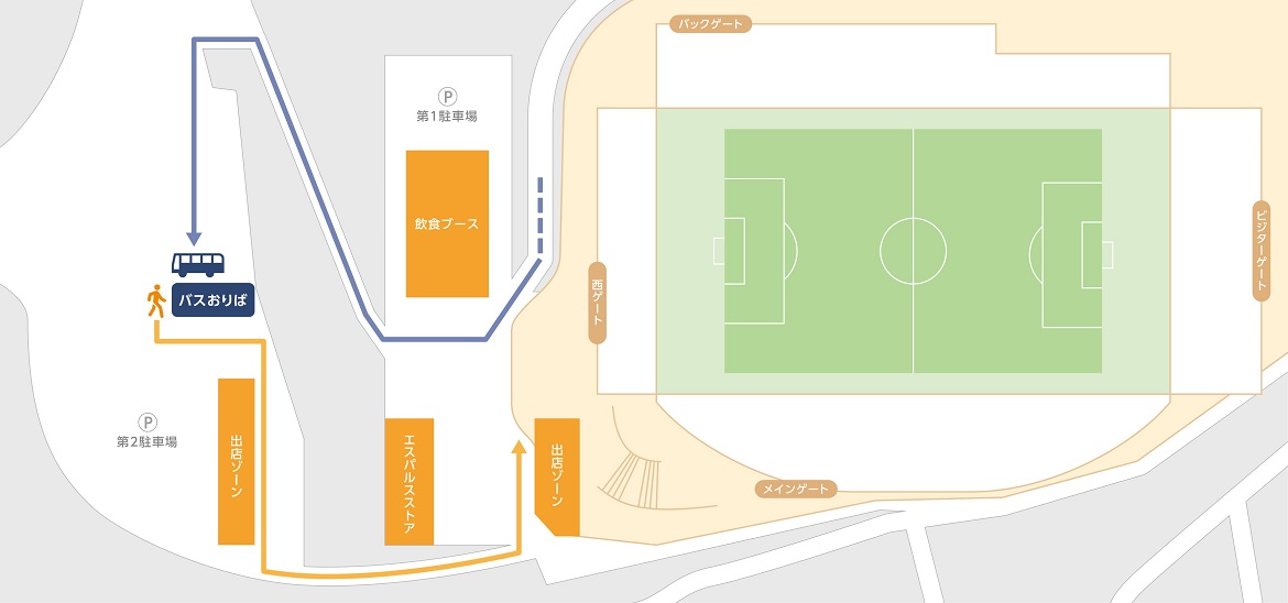 ・乗降場所が『スタジアム第2駐車場』へ変更となります。行きは降車場所が『スタジアム第2駐車場南側』、帰りは『スタジアム第2駐車場北側』となります。