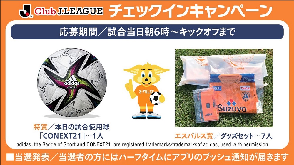 観戦チェックインを行うにはお使いのスマートフォンの位置情報オン設定が必要となります。また、当選のPush通知を受信されるには、アプリとスマートフォンの設定にてPush通知を受け取る設定を行ってください。本キャンペーンの応募ページにアクセスした場合、清水エスパルスがお気に入りクラブに追加されます。