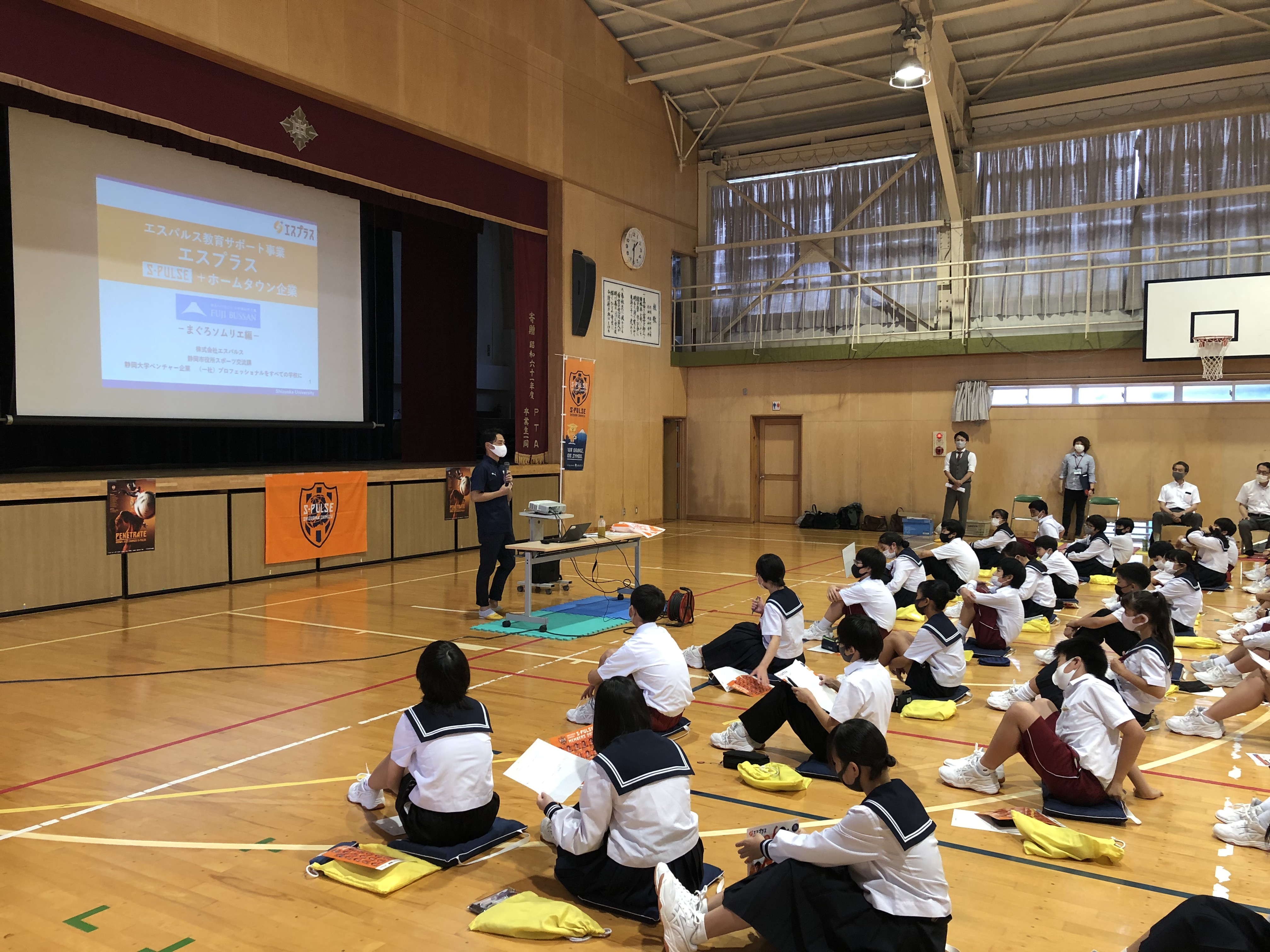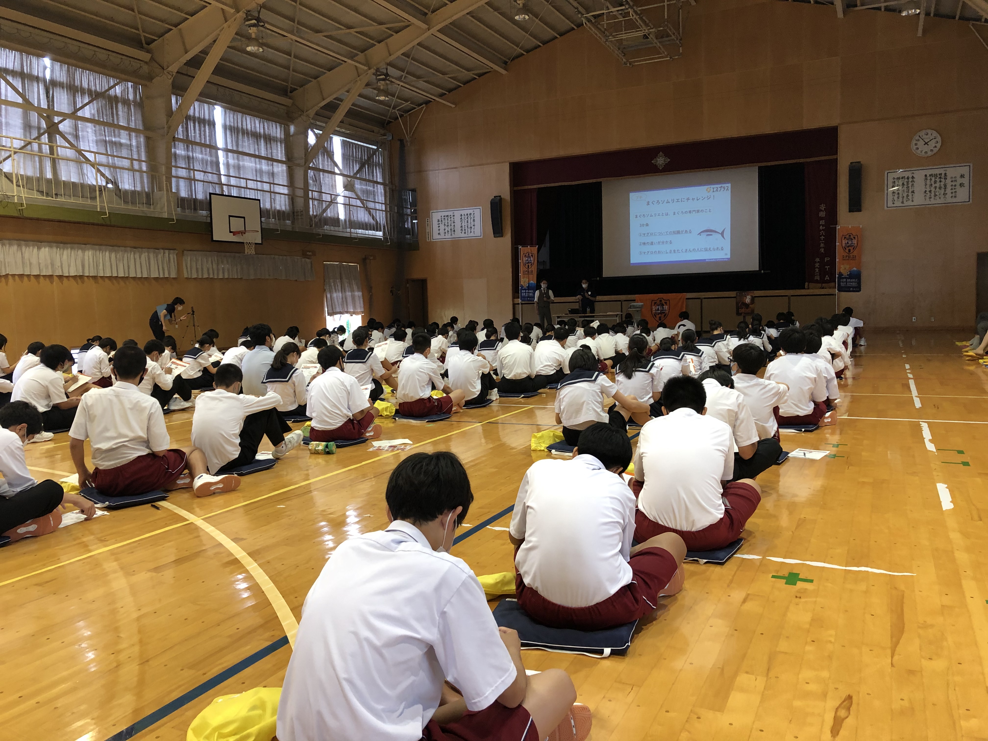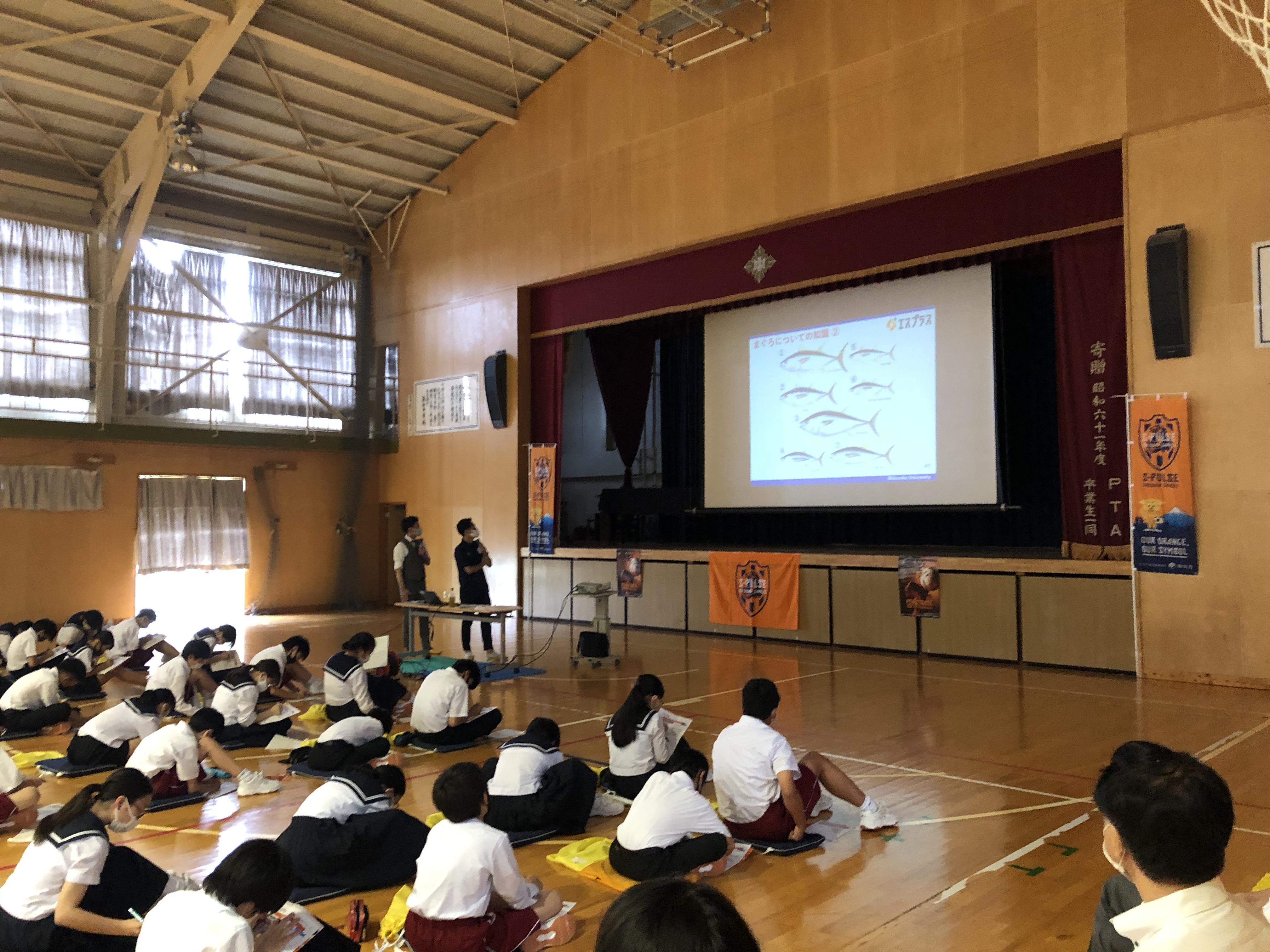 企業とのコラボレーション授業として開催した今回の『エスプラス』は、フジ物産株式会社にご協力いただき、同校の中学2年生123名を対象に『地域貢献や社会に出て必要なチカラを考えるキャリア教育授業 ~まぐろソムリエ編~』を実施しました。