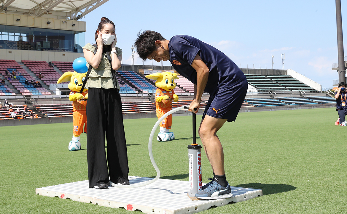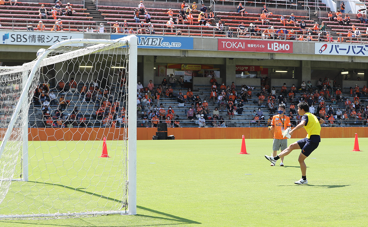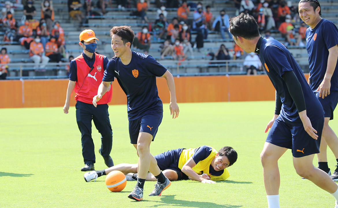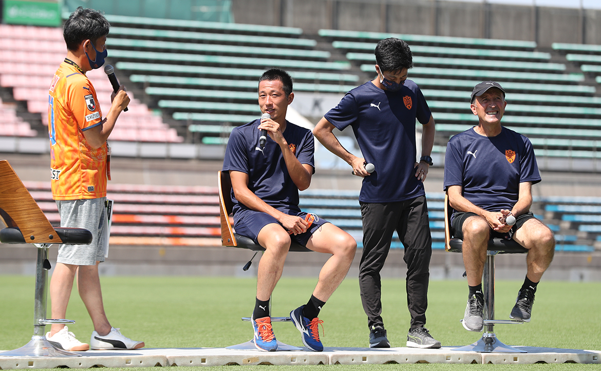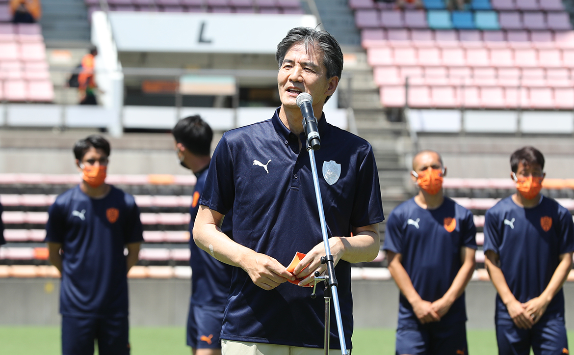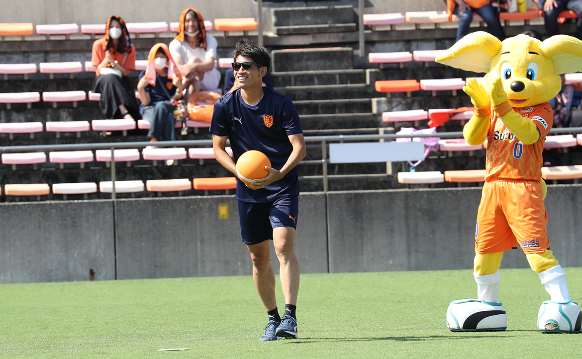 まずは山室晋也社長の挨拶。「皆さん、日頃エスパルスを応援いただき誠にありがとうございます。今日はこの炎天下のなか、「S-PULSE SUPPORTERS THANKSDAY 2021」に多数ご来場いただき本当にありがとうございます。水分をこまめにとっていただき、体調管理をしっかりして楽しんでください。午前中から色々な催し物がありましたが、午後からは選手に参加してもらって盛り上げていきたいと思います。今回、この日のために選手たちは何回もミーティングを行い、リーグ戦の前のミーティングよりも熱心なんじゃないかと思えるくらい、熱の入ったノリノリの企画が満載になっていますので、日頃見られないピッチ上での笑顔を楽しんでいただければと思います。今日はリラックスモードで楽しみたいと思いますが、必ず後半戦は勝ち抜きたいと思いますので、ぜひ応援をよろしくお願いします。今日はよろしくお願いします」