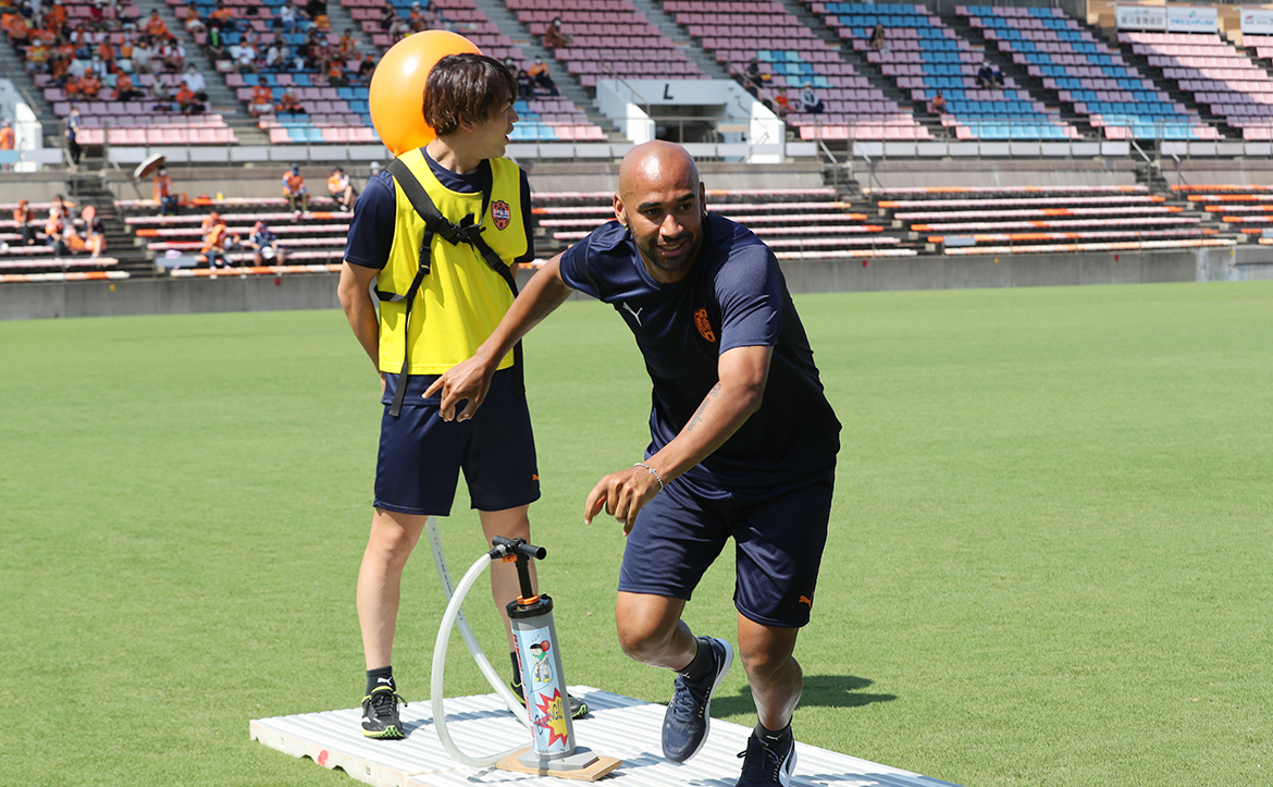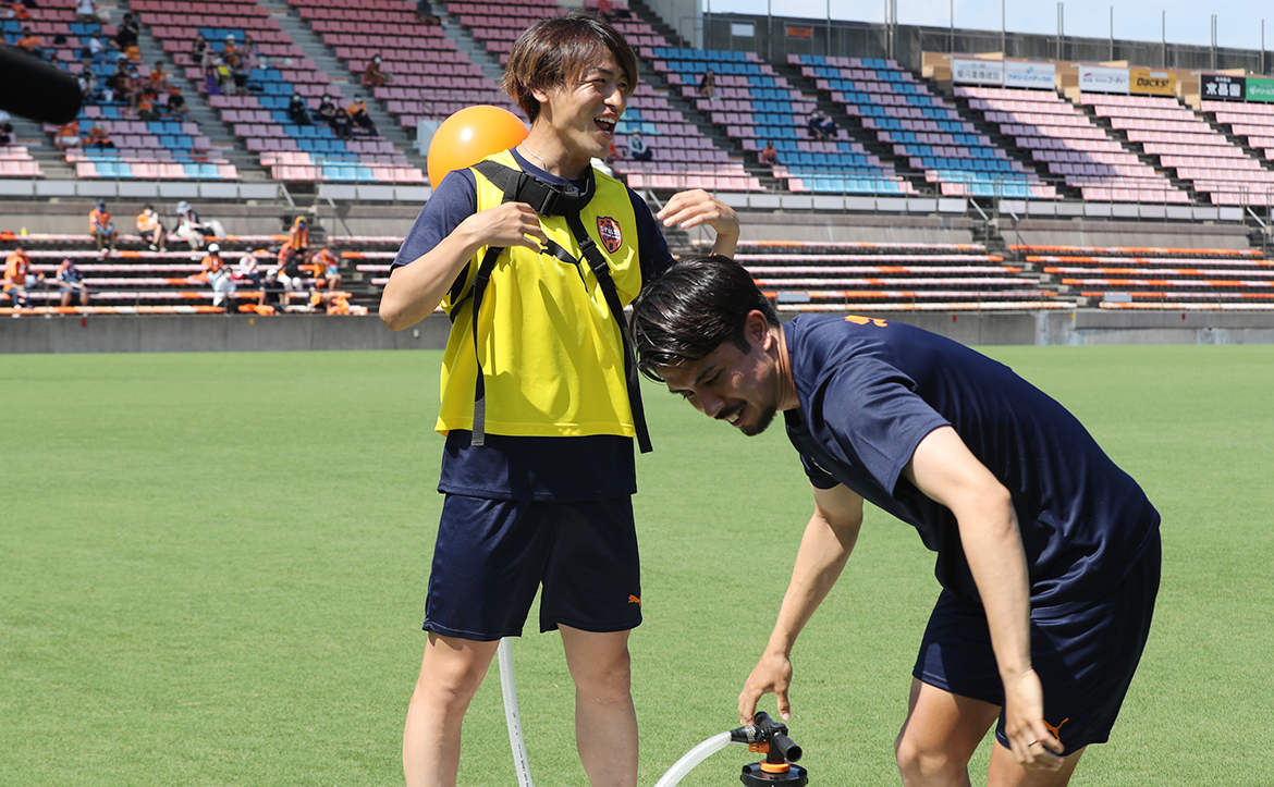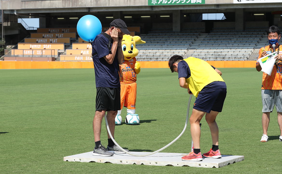 対決に戻り、今度は「風船割り対決」へ。1回戦は「清水ヤングボーイズ」の中村慶太選手、「03」のロティーナ監督の背中につけられた風船を、相手チームが空気入れを使って風船を膨らまし、早く割った方が勝ちとなります。1回戦、2回戦とも「清水ヤングボーイズ」が勝利し、ポイントを稼ぎます。