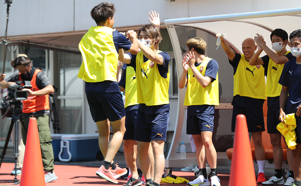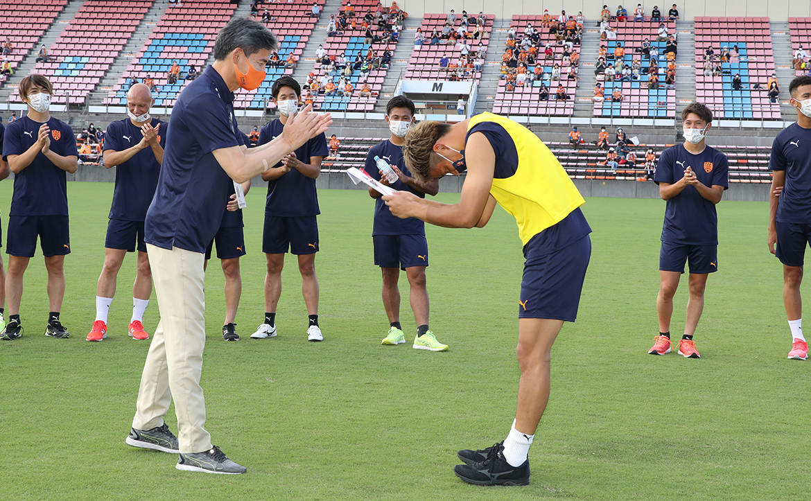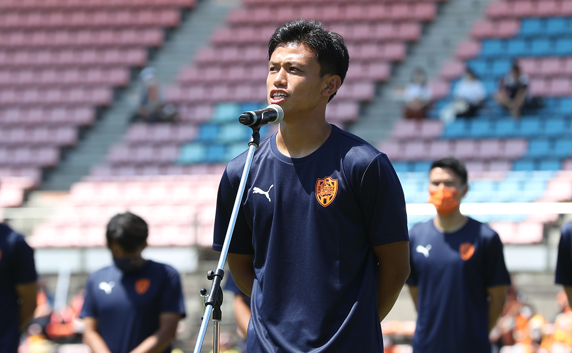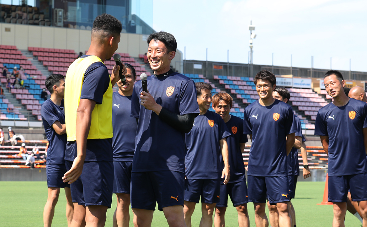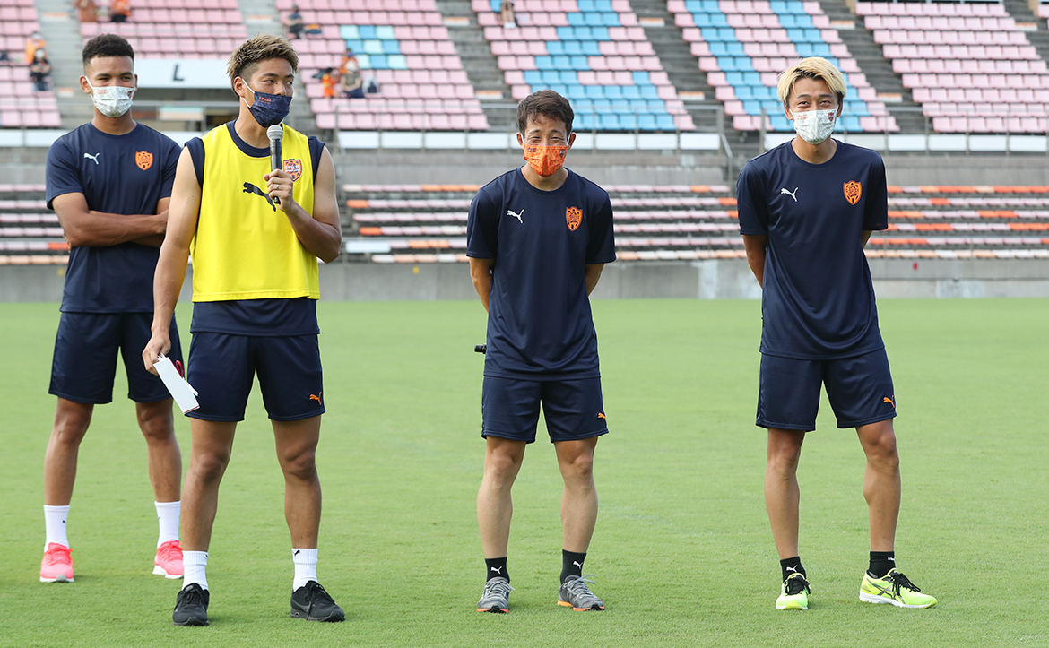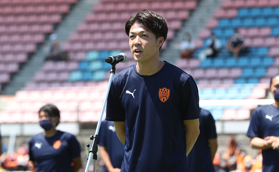 続いて選手会長の西澤健太選手による開会宣言。ですが、「皆さん、こんにちは。この暑いなか、たくさんの方にお越しいただき、ありがとうございます。開会の挨拶とさせていただきたいのですが、先ほどリリースがあった通り、石毛秀樹選手がファジアーノ岡山に期限付き移籍することが決まりました。一言いただきたいと思います」と、急遽、石毛選手の挨拶となりました。