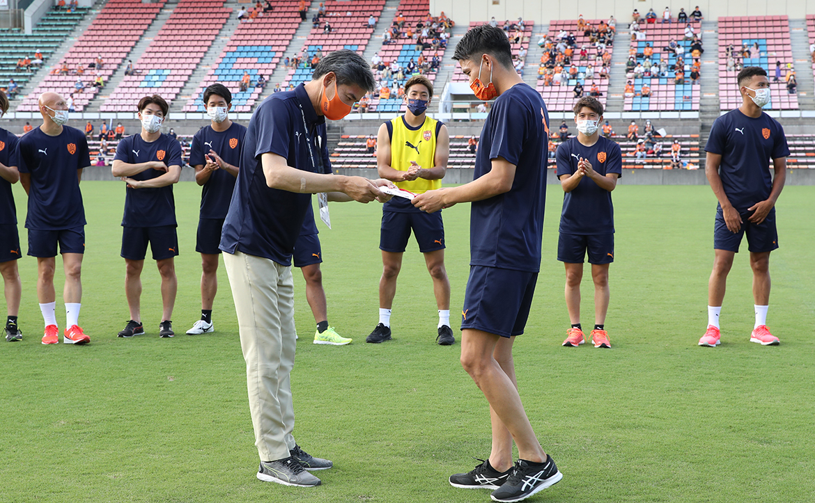 「閉会式」。まずは山室社長より、勝利チームの「03」を代表して鈴木義宜選手に、「私は焼き肉が食べたいの!」でおなじみ「焼肉飯店 京昌園」のお食事券、チーム全員分が贈呈されました。そして、MVP賞は永井選手に決定。「サガミシード株式会社」から、家族全員でキャンプデビュー!静岡市街地から車で20分!気軽に行けるキャンプ&バーベキュー場、「さんかく山 CAMPフィールド」利用券が贈呈されました。