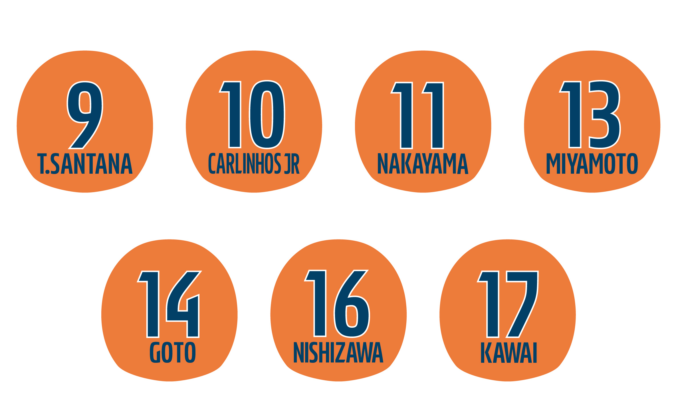 #2立田,#4原,#5ヴァウド,#6竹内,#7片山,#9チアゴ,#10カルリーニョス,#11中山,#14後藤,#16西澤,#17河井,#18エウシーニョ,#19ディサロ,#20中村,#22ヘナト,#23鈴木唯人,#25永井,#37権田,#50鈴木義宣
