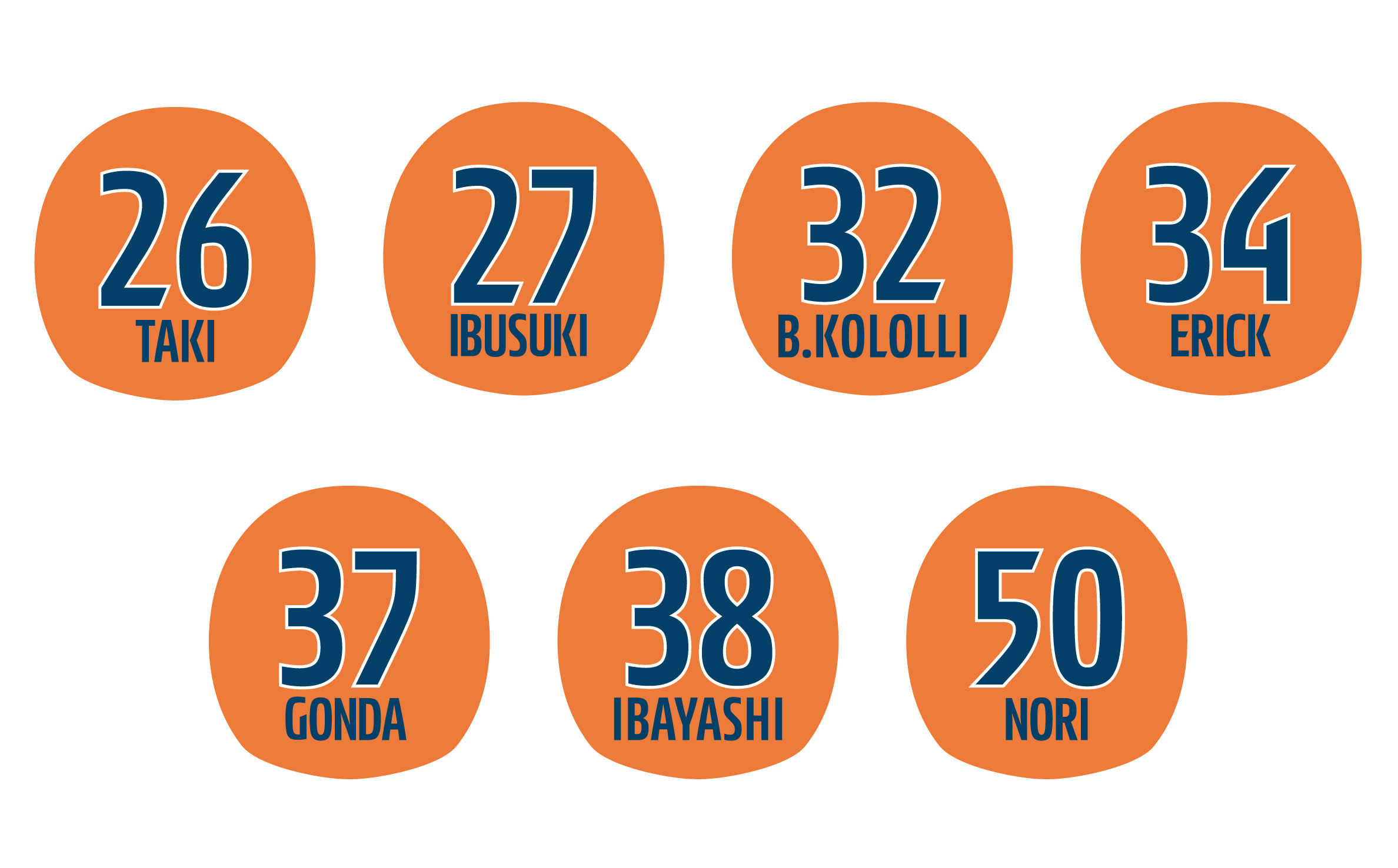 #1大久保,#2立田,#3ホナウド,#4原,#5ヴァウド,#6竹内,#7片山,#9チアゴ,#10カルリーニョス,#11中山,#13宮本,#14後藤,#16西澤,#17河井,#18エウシーニョ,#19ディサロ,#20中村,#21奥井,#22ヘナト,#23鈴木唯人,#25永井,#26滝,#27指宿,#32コロリ,#34エリック,#36栗原,#37権田,#38井林,#50鈴木義宣
