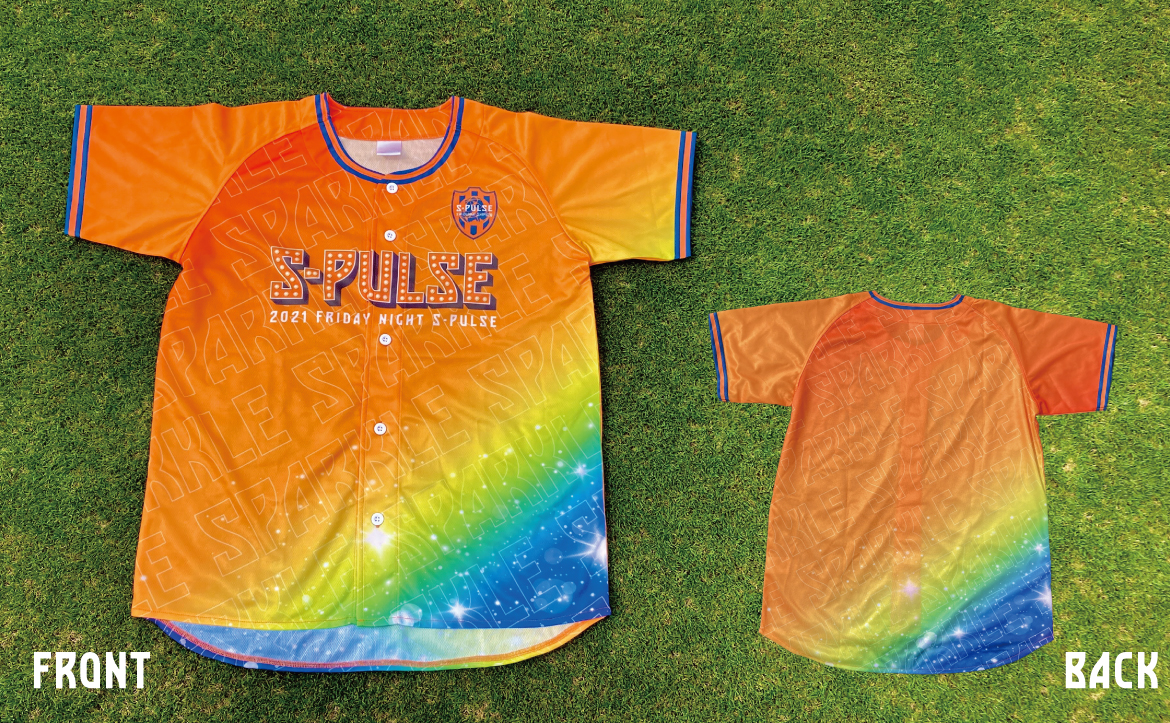 エスパルスオレンジをメインに、レインボーカラーのグラデーションを入れ、胸の「S-PULSE」ロゴもピカピカ光る照明のようにしてみました!ボディには「SPARKLE」の文字も入っています。このシャツを着て、ぜひ一緒に楽しみましょう!