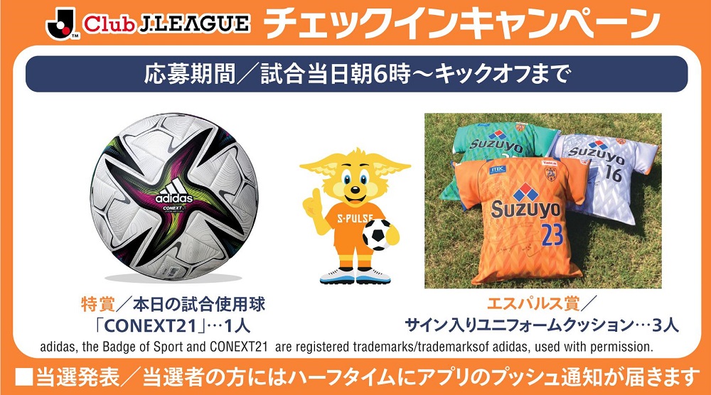 観戦チェックインを行うにはお使いのスマートフォンの位置情報オン設定が必要となります。また、当選のPush通知を受信されるには、アプリとスマートフォンの設定にてPush通知を受け取る設定を行ってください。本キャンペーンの応募ページにアクセスした場合、清水エスパルスがお気に入りクラブに追加されます。