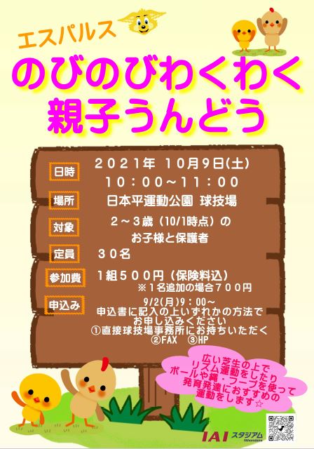 IAIスタジアムにおいて、10月9日(土)に開催される「エスパルス のびのびわくわく親子うんどう」の参加者を募集いたします。