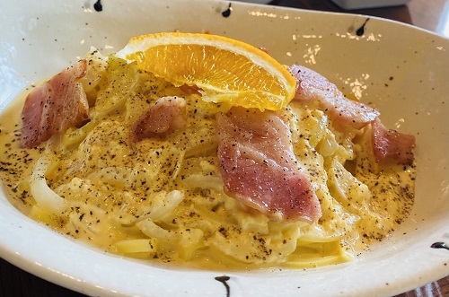 純正生クリームを使用したソースにオレンジ果汁の爽やかさをプラス生パスタを使いもっちり感がある本格カルボナーラです!!