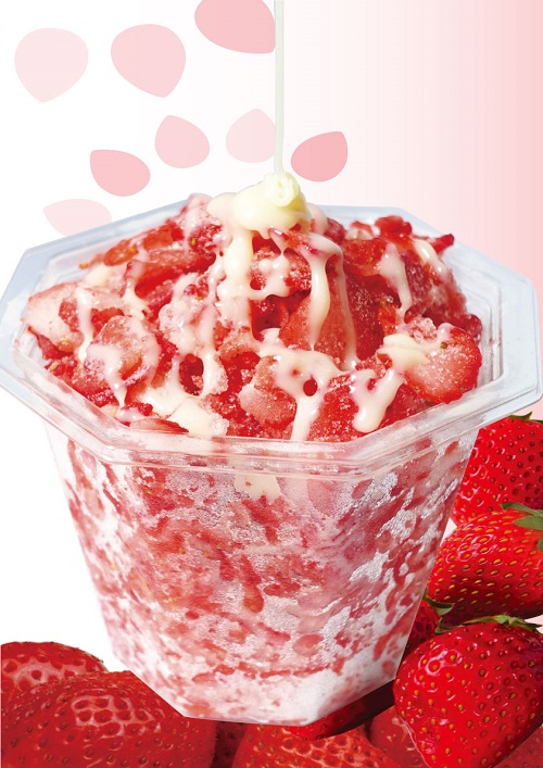 急速冷凍をかけた福岡県産のあまおうをまるごと削った逸品。練乳をかけてお召し上がりください。
