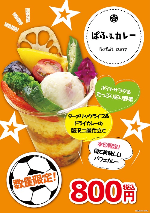 アイスタにご来場の全ての女性サポーターの皆さまにご賞味頂きたい ヘルシーで美味しく何よりも可愛らしい『ぱふぇカレー』が出来ました。インスタ映え間違いなし!!オレンジウェーブ監修の新商品をお楽しみください。天神屋アイスタ売店にて限定50食の販売です。