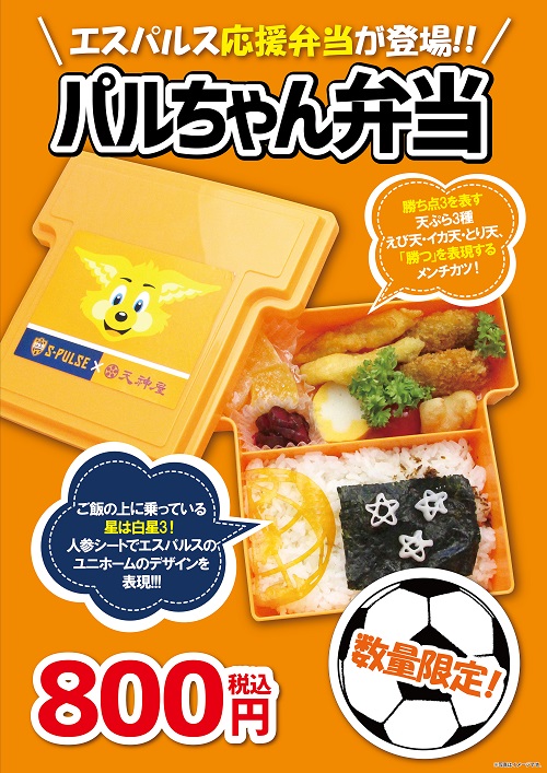 大変お待たせいたしましたっ!! エスパルスの勝利を導くパルちゃん弁当の登場だ~ッ!! ご飯の上には、勝ち点3をイメージした【白星】にユニホームのデザインを表現した人参シート。おかずには、えび天・イカ天・とり天の勝ち点3にメンチ「カツ」と、エスパルスの勝利を願って作ったお弁当です。このお弁当を食べたらエスパルスの勝利、間違いなしっ!!