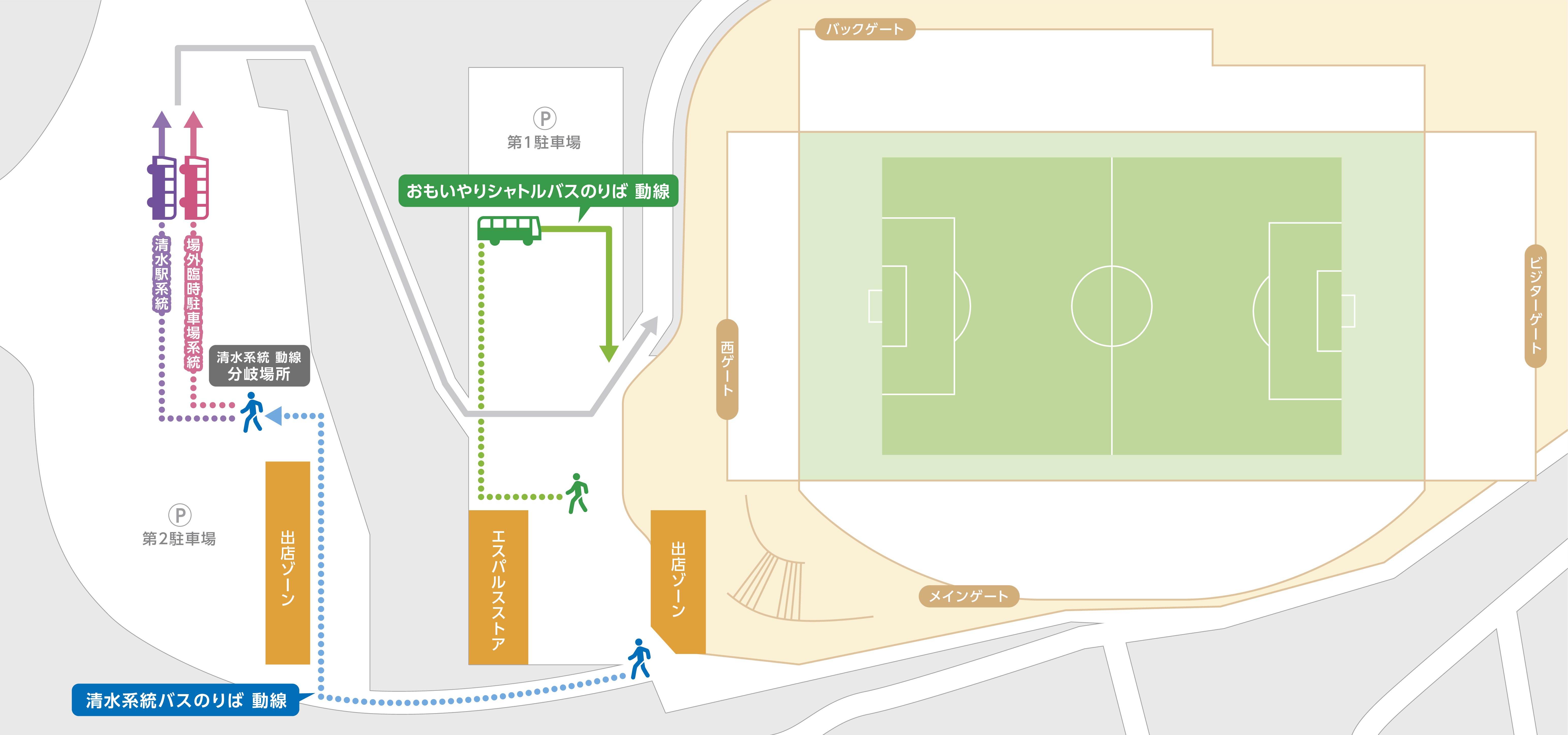 ・乗降場所が『スタジアム第2駐車場』へ変更となります。行きは降車場所が『スタジアム第2駐車場南側』、帰りは『スタジアム第2駐車場北側』となります。