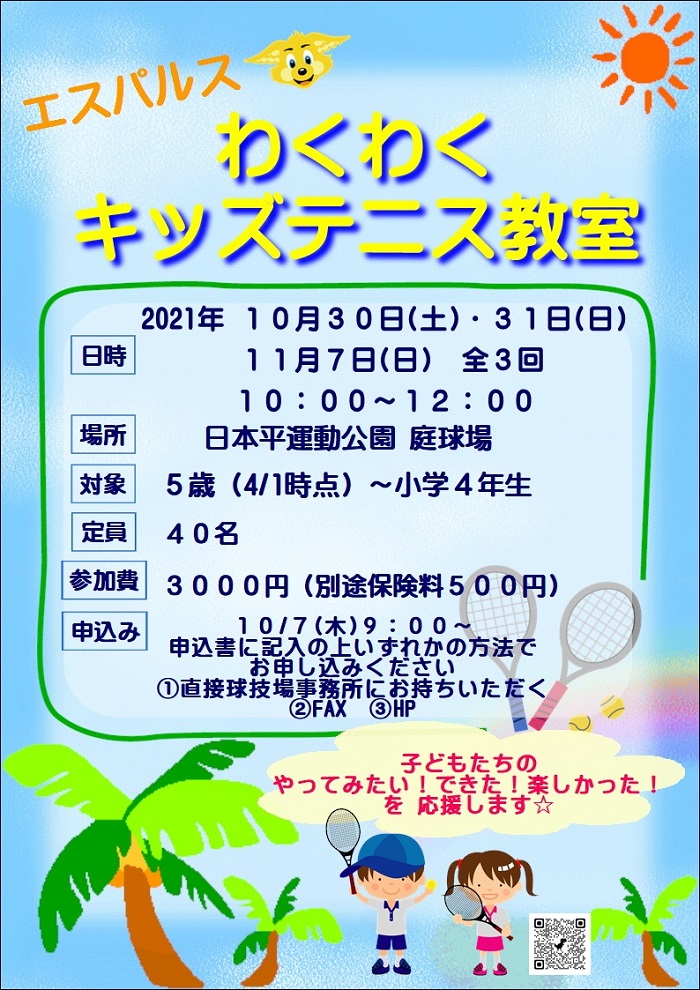 IAIスタジアムがある清水日本平運動公園の庭球場において、延期となっておりました「エスパルスわくわくキッズテニス教室」の参加者を募集中です。大変長らくお待たせいたしました。