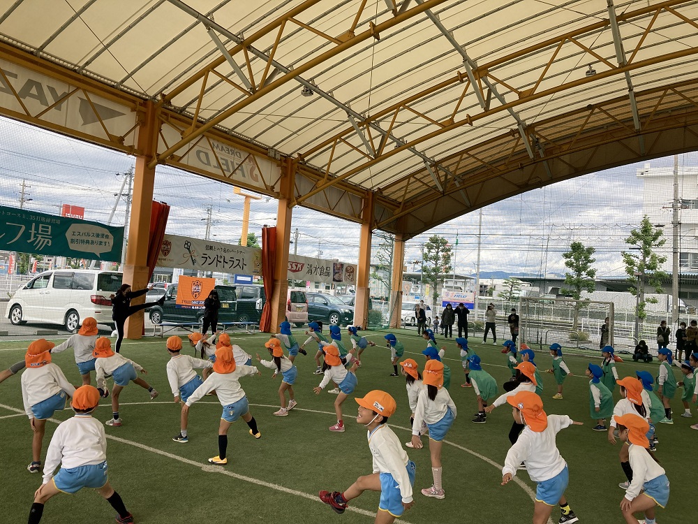 エスパルスダンススクール渚先生のダンスから始まりました。みんな元気に踊り、笑顔が見られました。サッカーのボール遊びやドリブルも上手にチャレンジし、最後のゲームも白熱!「サッカーやダンスが好きになった!」との声が聞けました。