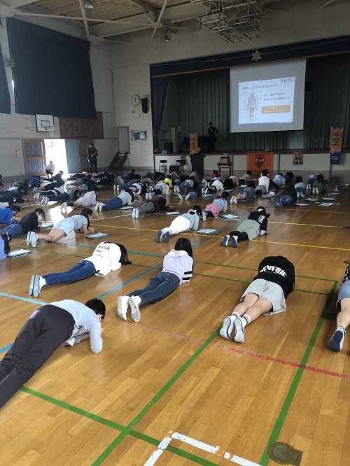 次に、「シュートと理科の関係」では、身体の構造について学び、サッカーに必要な筋肉の中でも体幹はとても重要な筋肉で、バランスが悪いとシュートも出来なくなってしまうことが分かりました。プロの選手たちが実際にやっている体幹トレーニングを、実際に全員でチャレンジし、20秒の体幹トレーニングでもお腹にかなりの負担を感じたようです。