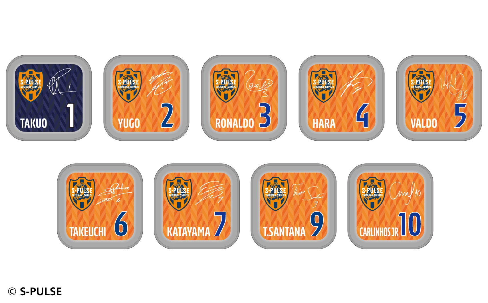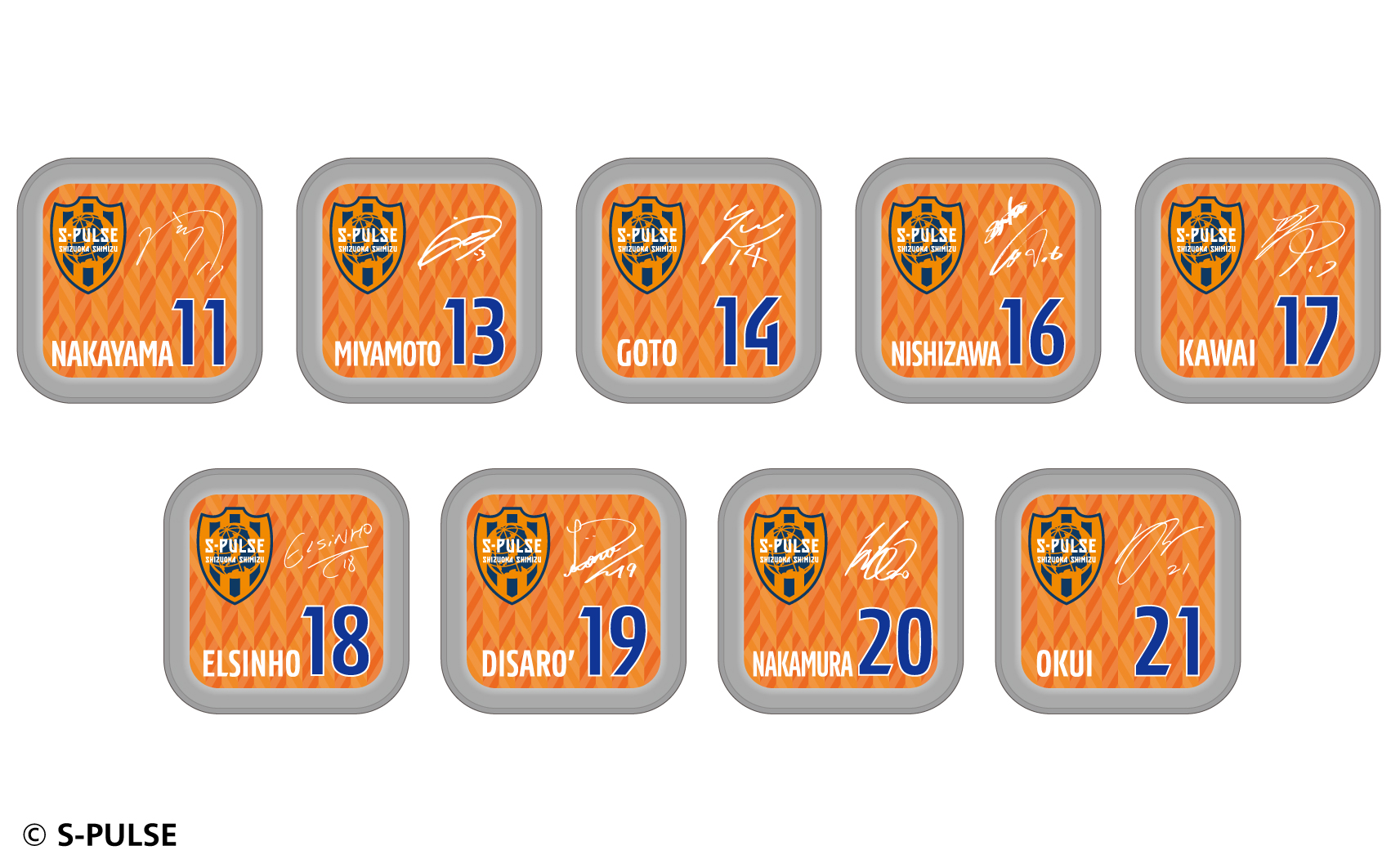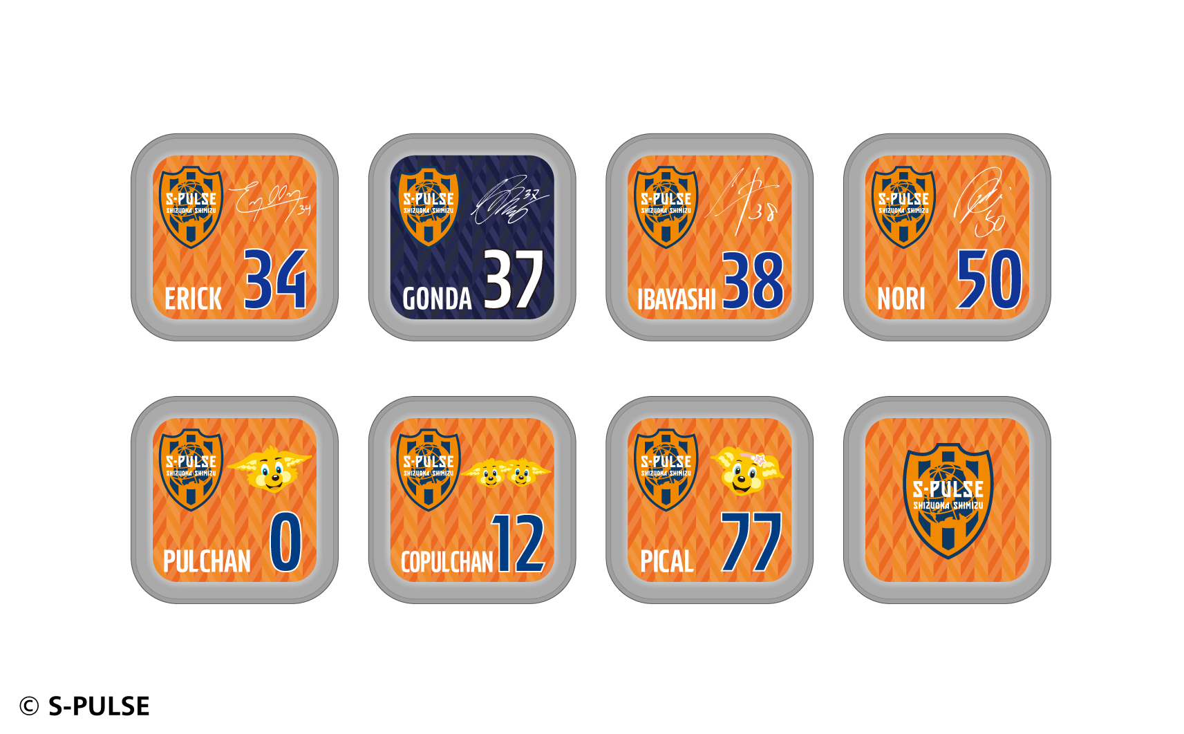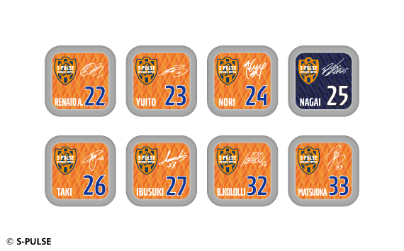 #1大久保,#2立田,#3ホナウド,#4原,#5ヴァウド,#6竹内,#7片山,#9チアゴ,#10カルリーニョス,#11中山,#13宮本,#14後藤,#16西澤,#17河井,#18エウシーニョ,#19ディサロ,#20中村,#21奥井,#22ヘナト,#23鈴木唯人,#24藤本,#25永井,#26滝,#27指宿,#32コロリ,#33松岡,#34エリック,#37権田,#38井林,#50鈴木義宣,#0パルちゃん,#12こパルちゃん,#77ピカル,エンブレムデザイン