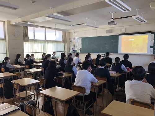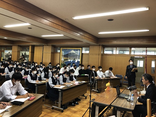 会議室に集まった約50人の生徒と、各教室にライブ配信される映像を視聴する生徒合わせて763人に対して行われた講演の冒頭で山室社長は、「皆さんは商業の授業で減価償却や繰延資産などについて学んでいると思います。企業を数字で見ることができるということは、これから社会に出て働く時にとても役立ちます。」と話し、簿記などの商業科目を学ぶ高校生の背中を押しました。