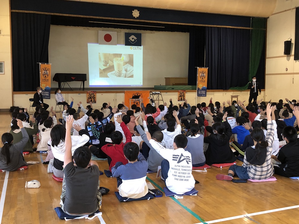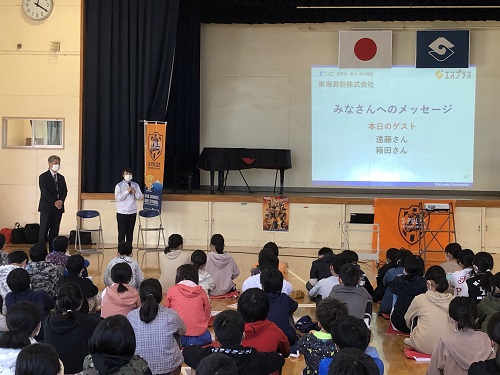 11月1日(月) 静岡市立長田東小学校にて、クラブパートナーの東海澱粉株式会社よりゲスト講師2名を迎え『エスプラス』「地域貢献や社会に出て必要なチカラを考えるキャリア教育授業 ~食品商社編~」を実施しました。