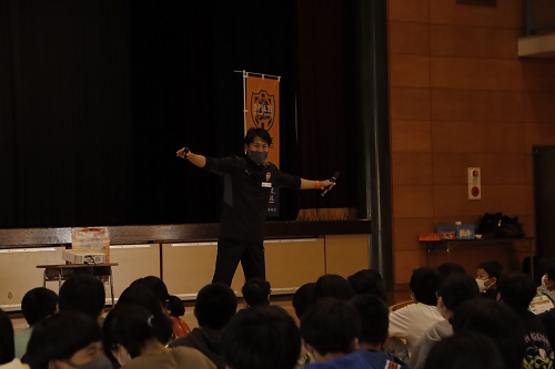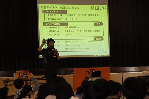 最初に、エスパルスについていくつかのクイズから始まりましたが、生徒たちはエスパルスについてよく知っている様子。その後、久保山コーチが自己紹介をしながら、「選手時代にどう過ごしてきたか、その後今の仕事にどう活かされているかを話していきます。今日はぼくのことを、くぼ先生!と呼んでください。」と授業が始まりました。