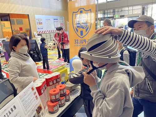 静岡商業が出展する「防災かるた・防災すごろく」ブースをはじめ、様々な館内イベントへのパルちゃんの参加のほか、東海地区6クラブの防災への取り組み『ソナエル東海』の紹介、パートナー企業であるタイカ様の『でるキャップ』、江崎グリコ様の『ビスコ保存缶・常備用カレー職人』、コアレックス信栄様の『備蓄用トイレットペーパー』などの防災関連商品を展示しました。