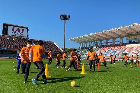 まず初めに、開場前のピッチでスクールコーチによるスポーツ教室を行いました。