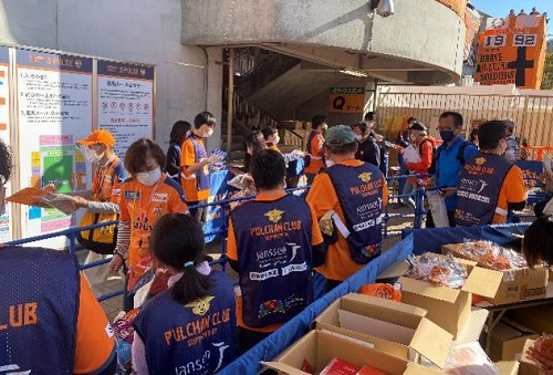 来場者プレゼントのハンドクラッパーやサンプリングの配布に加え、アルコール消毒の声掛けを行いました。今季、複数回参加されている方も多く、慣れた手つきで、来場するお客さまに対して笑顔で「ご来場ありがとうございます」と声を掛けながら活動している姿が印象的でした。