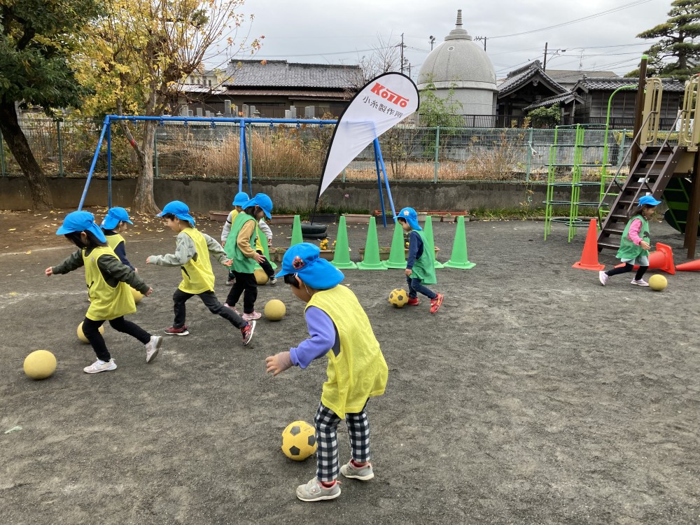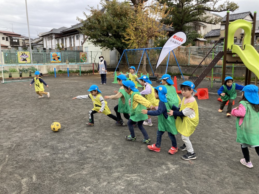 途中雨も降りましたが、最後まで元気よく活動ができました。コーチのお話も目と耳でよく聞いて、転んでも泣かずに一生懸命ボールを追いかけました。あきらめずにチャレンジすることで最後は「できた!」という声をたくさん聞くことができました。