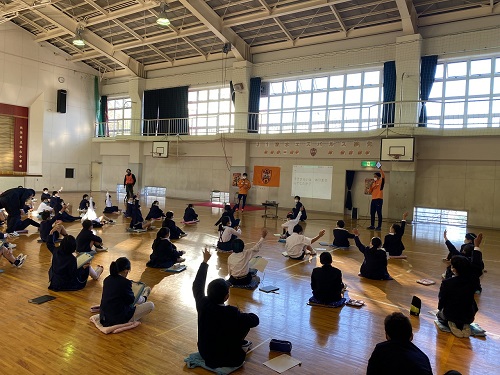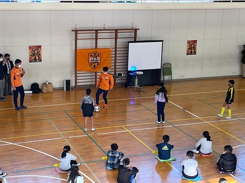 授業ではまず滝選手が華麗なリフティングを披露すると、権田選手も負けじと体育館の端から端までの大遠投を披露し、児童からは大きな歓声が上がりました。