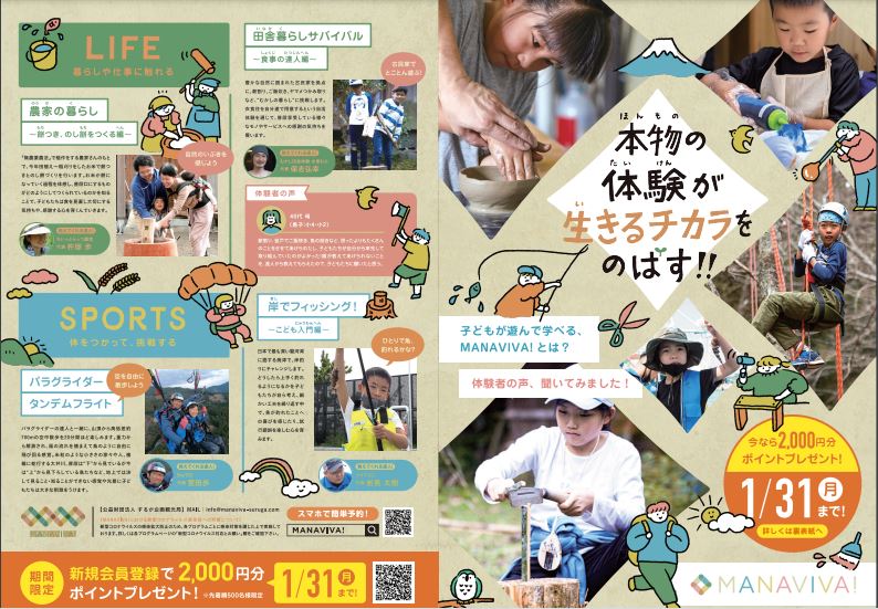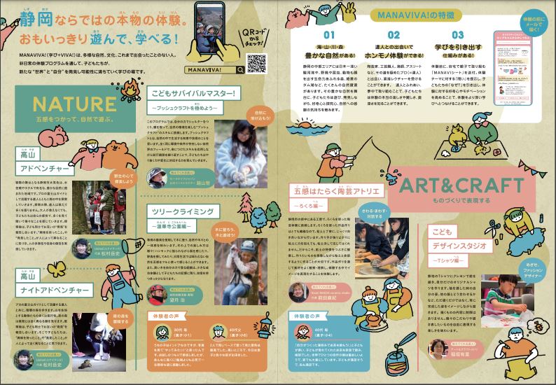 キャンパスは、ひろーい静岡 MANAVIVA!(学び+VIVA!)は、多様な自然、文化、これまで出会ったことのない人。非日常の体験プログラムを通して、子どもたちが、新たな”世界”と”自分”を発見し、可能性に満ちていく学びの場です。