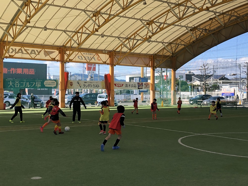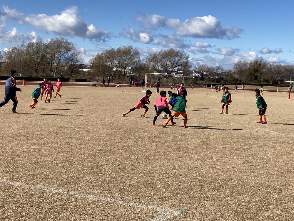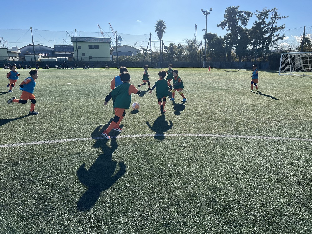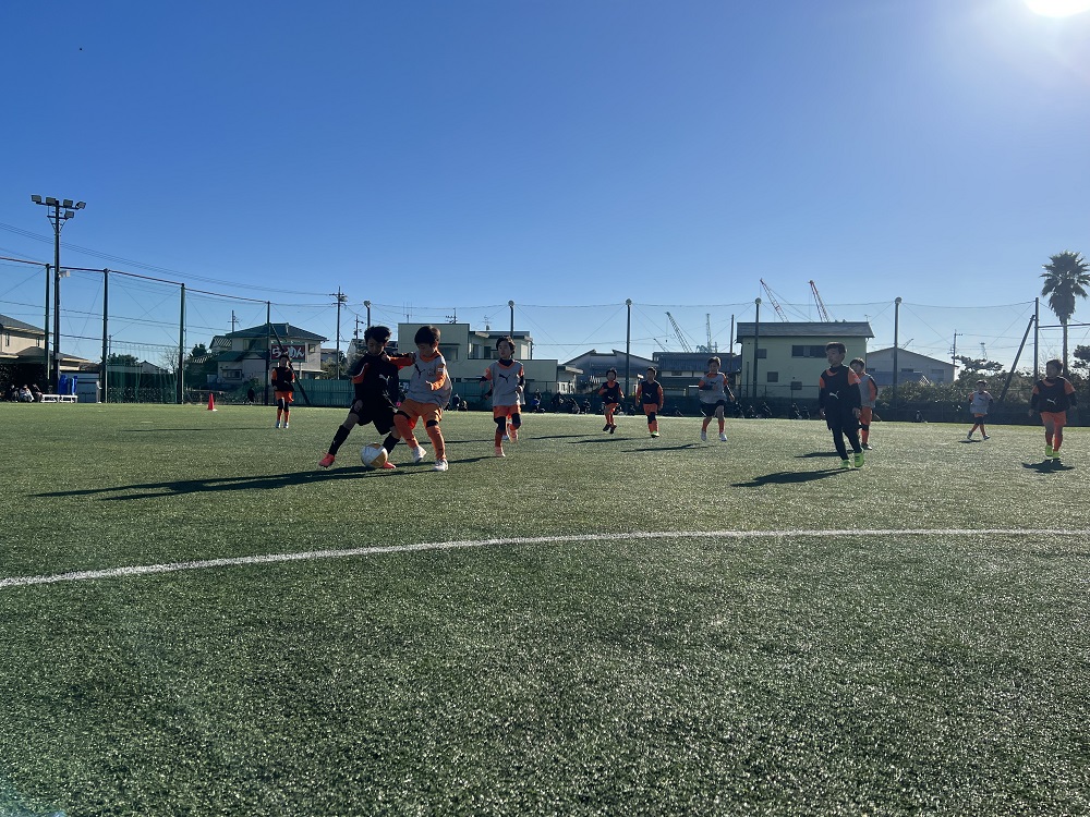 1年生は「2対1や2対2」2年生は「1対1」と「2対2」のトレーニングをし、普段スクールとは違う仲間といっしょにプレーしました。ゲームは白熱し、寒さを吹き飛ばすスーパーシュートや学んだことを活かしチャレンジする姿が見られました。