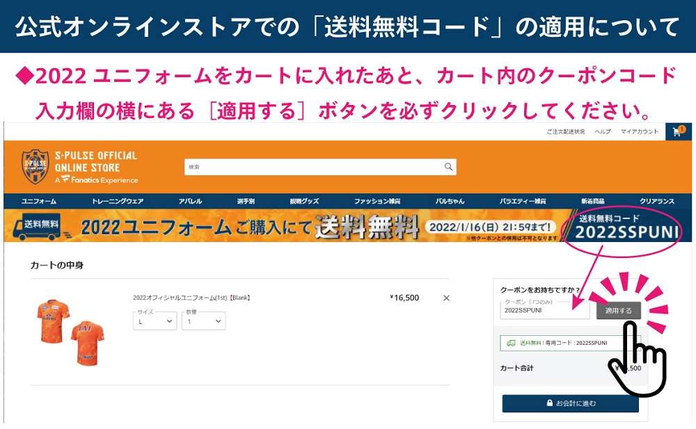 2022ユニフォームをカートに入れた後、カート内でクーポンコードを入力し、入力欄横の「適用する」ボタンをクリックいただくと、送料無料が適用されます。