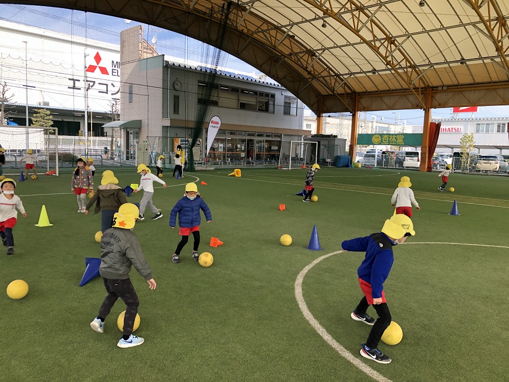 風が強い中でしたがこども達は元気よく活動していました。また、難しい事にも積極的にチャレンジして最後まで頑張っている様子でした。最後に試合でもゴールを目指してドリブルしている姿が印象的でした。