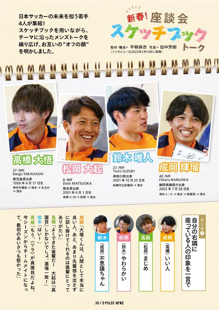 エスパルスアプリ×『S-PULSE NEWS』連動企画! 髙橋大悟×松岡大起×鈴木唯人×成岡輝瑠の4名でスケッチブックを用いた座談会を実施しました。アプリ編では、4人がテーマに沿った“ランキング付け“に挑戦。それぞれの個性や関係性が垣間見えるメンズトークをお楽しみください(取材日=1月14日)