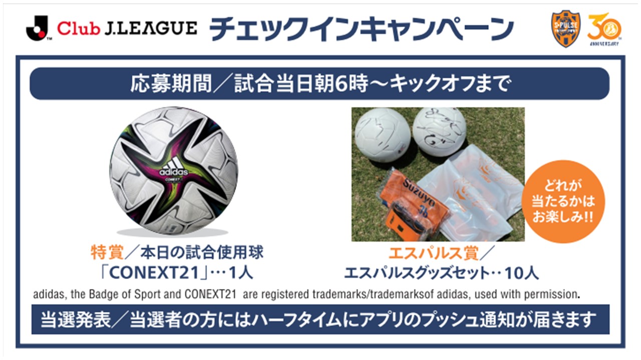 観戦チェックインを行うにはお使いのスマートフォンの位置情報オン設定が必要となります。また、当選のPush通知を受信されるには、アプリとスマートフォンの設定にてPush通知を受け取る設定を行ってください。本キャンペーンの応募ページにアクセスした場合、清水エスパルスがお気に入りクラブに追加されます。