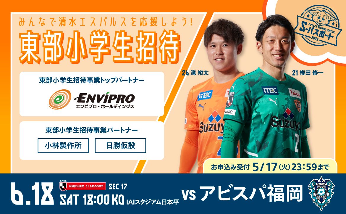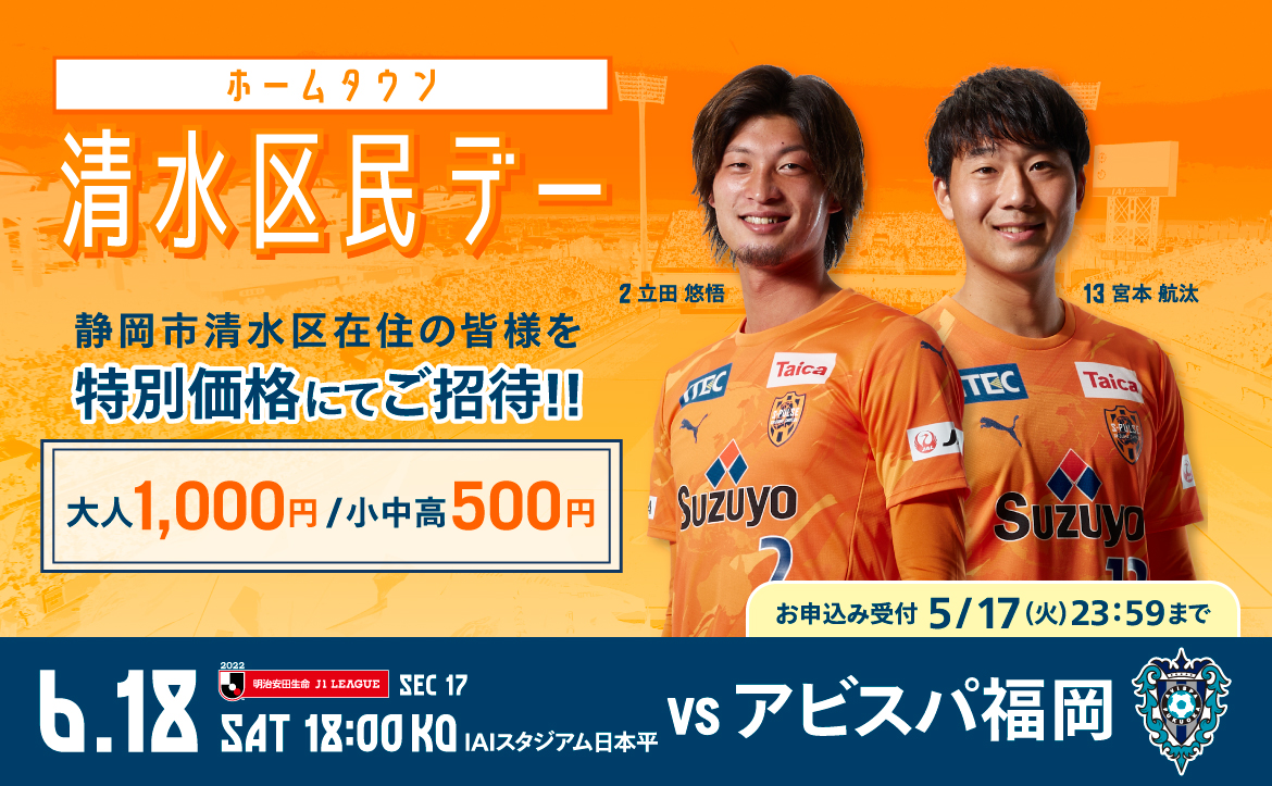 6月18日(土)に行われる2022明治安田生命J1リーグ第17節 アビスパ福岡戦(15:30開場/18:00キックオフ@IAIスタジアム日本平)についてお知らせいたします。なお、各イベント情報は随時更新いたします。