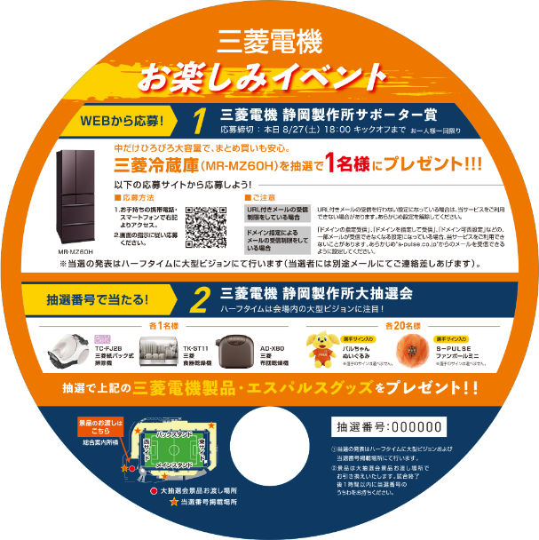 入場ゲートで配布する『三菱電機×S-PULSE オリジナルうちわ』の裏面に記載の抽選番号をご確認ください。